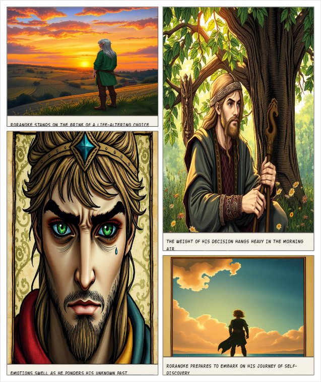create a short manga script about a boy named "Roranoke" a 17 year old elf cleric who on his 18th birthday finds himself battling between the choice of running off to become adventurer & discovering more about his past origins or stay in the quiet farm town just outside the kingdom he grew up in.