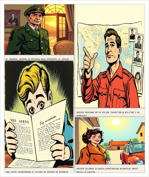 1. Viñeta 1: El general José Guadalupe Arroyo anuncia que escribirá sus “memorias” para defender su honor. 2. Viñeta 2: Arroyo presume su carrera militar, su educación y su “honradez intachable”. 3. Viñeta 3: Recibe una carta del general Marcos González, recién electo presidente, invitándolo a ser su secretario particular. 4. Viñeta 4: Arroyo celebra emocionado y viaja rumbo a la Ciudad de México.