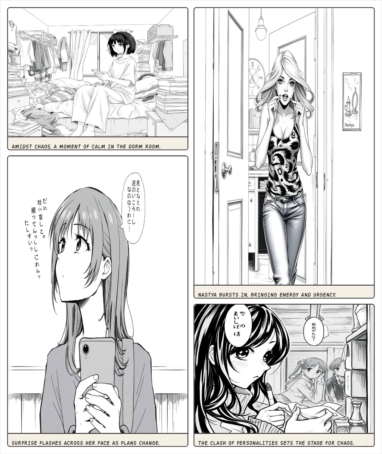 A dorm room. Student-style mess. A girl with dark hair sits on the bed, looking at her phone. Internal monologue: NASTYA (blonde) rushes into the room, applies lipstick on the go, and says “We're going to karaoke. We have half an hour to get ready.”