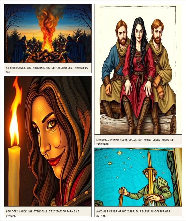 A group of mercenaries in blue and gold leather armor camped in front of a fire in the evening