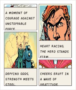 Panel 1: Hero stops a speeding train. Panel 4: Passengers clap. Final Panel: Hero whispers, “Please don’t tell my boss I’m late.”