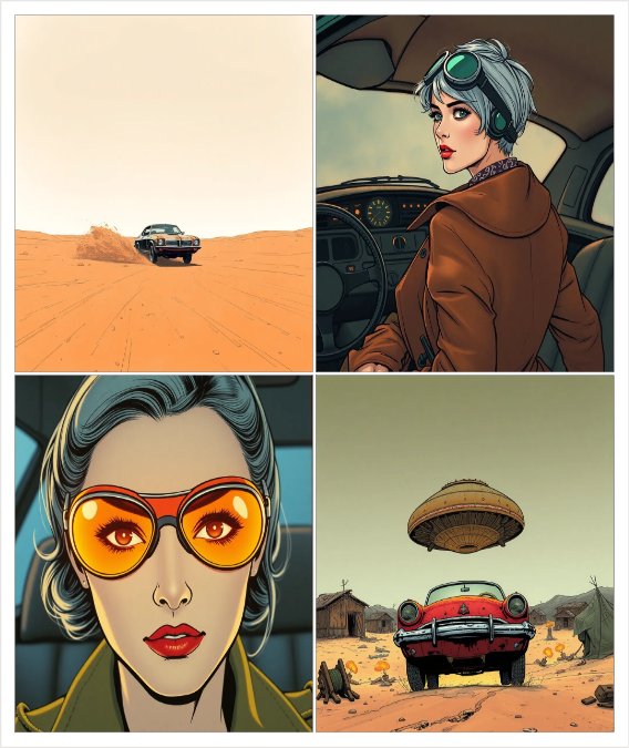 I generated images with the prompt: 'comic featuring a highly detailed photorealistic portrait of a 25-year-old athletic curvaceous woman with fair skin, cold and confident expression, short silver-gray hair styled in two small side buns, realistic proportions with moderate natural bust, wearing a long worn brown leather trench coat open with hood up, large round aviator goggles with glowing orange-yellow lenses on forehead, black paisley bandana lowered around neck revealing mouth, black leathe