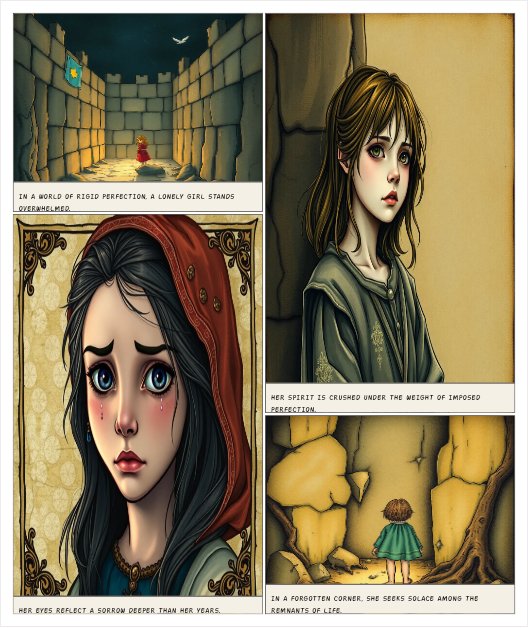 dark fantasy comic scene. A lonely little girl, around 9 years old, pale and exhausted, wearing simple old clothes, standing in a cold, overly organized world made of rigid walls, straight lines, and oppressive symmetry. The atmosphere feels suffocating, strict, artificial, and emotionally empty. The girl looks deeply unhappy, overwhelmed by pressure, rules, and false perfection. Her eyes show silent despair and exhaustion beyond her age. In a forgotten corner, near broken stones and dead roots,