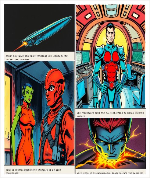 Vytvoř celostránkový sci-fi komiks (více panelů na stránce) s moderním komiksovým stylem, barevnější paleta (modrá, tyrkysová, oranžová, červená, fialová), silné kontrasty, dramatické světlo, detailní kresba, filmová atmosféra. Příběh a texty MUSÍ BÝT PSANÉ V ČEŠTINĚ. Hlavní postava je VEX – drsný galaktický bojovník, modro-tyrkysové brnění, červené energetické jádro na hrudi, cizácký obličej, futuristická zbraň. DĚJ KOMIKSU: Vex je členem speciální galaktické jednotky na palubě vesmírné lodi. T