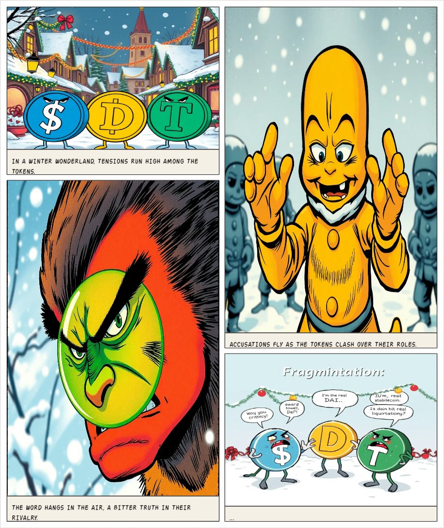 Create a three-panel comic in a festive Christmas style, themed around Codex and the idea of unifying liquidity in DeFi. Panel 1 — “Fragmentation” In a snowy holiday setting (snow, garlands, ornaments), three anthropomorphic tokens are arguing: USDC (blue circle with white $) DAI (yellow circle with letter D) Tether (green circle with letter T) All have angry faces, expressive hand gestures, and speech bubbles like: “I’m the real stablecoin!” “You’re draining liquidity!” “Fragmentation