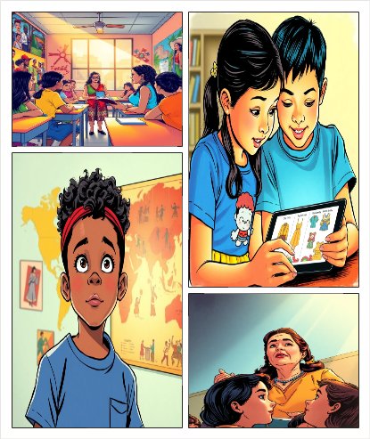 A diverse classroom with students from different cultures, colorful educational style, Latin Amer...