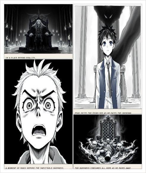 Panel 1 (Full-width, dramatic): A vast dark throne hall. A man with long hair and glowing pink eyes sits on a throne. His shadow stretches unnaturally. Narration: In a place beyond reality… Panel 2: A school boy (VOID) stands before the throne, trembling. The shadow completely covers him. Panel 3 (Close-up): Void’s eyes widen… then roll back. SFX: THUD Panel 4: Void collapses into darkness.