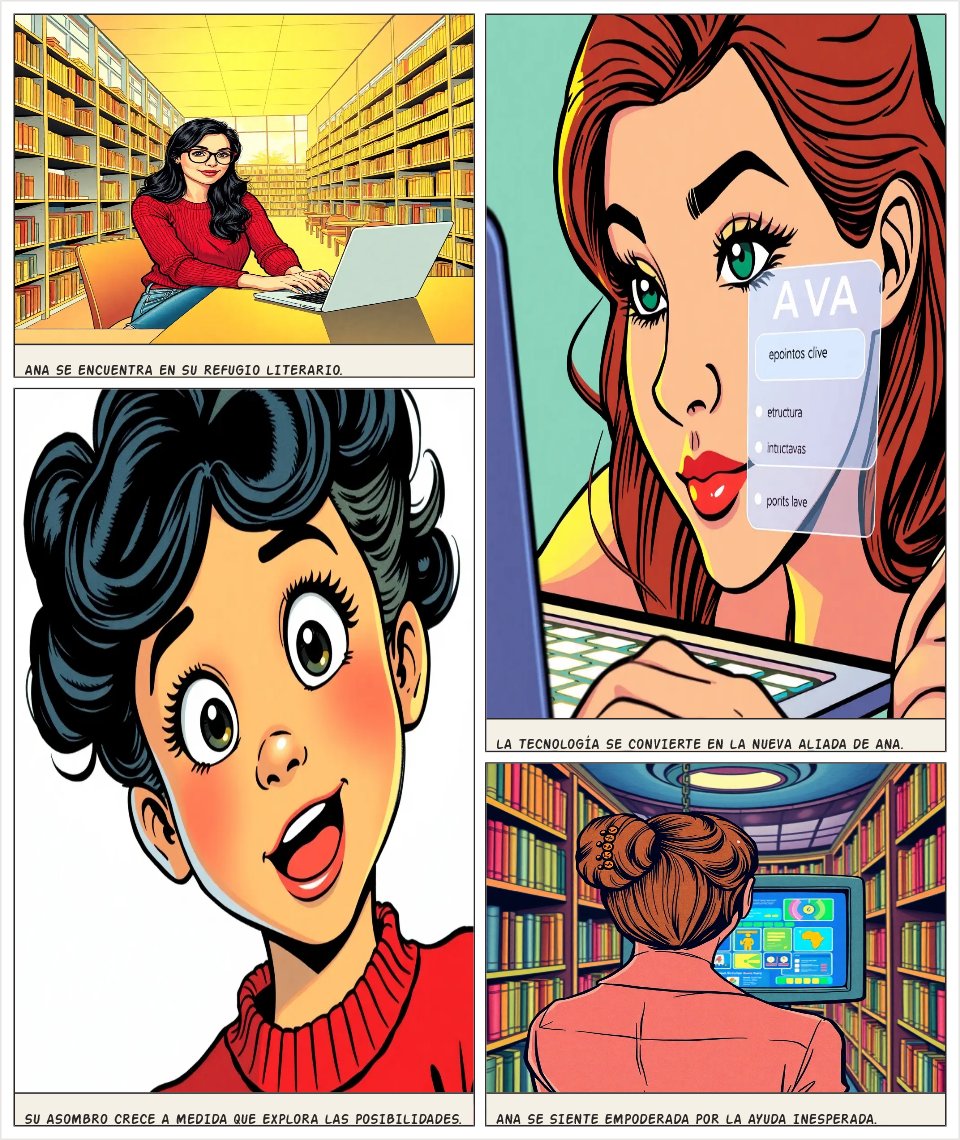 Viñeta 3: Imagen: Ana interactuando con una interfaz amigable de AVA. AVA muestra sugerencias de estructura, puntos clave y conexiones entre diferentes fuentes. Texto (AVA): "Puedo ayudarte a resumir artículos, sugerir enfoques innovadores y generar esquemas para tu ensayo, basado en tus objetivos." Texto (Ana, sorprendida): "¡Wow! Esto es como tener un co-piloto para mi cerebro."