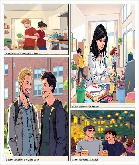Chris & Jenny Panel 1: Chris (caucasian, shorter, blond hair, glasses) and Jenny (caucasian, black hair) juggling kids and coffee in a busy home. Panel 2: Nathaniel, Harrison, and Evelyn running through the house while Jenny works and crafts nearby. Mark & Connor Panel 3: Mark (caucasian, blond hair) and Connor together at a distance, laughing quietly. Alex & Donald Panel 4: Alex (caucasian, brown hair, backwards hat) and Donald (caucasian, brown hair) hosting a lively party.