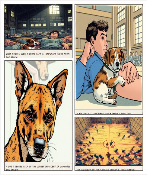 Evacuation center, morning. Families resting on mats. Seb, the dog leans beside his owner, Dio. ...