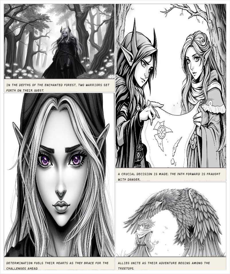 BEAUTIFUL FEMALE DARK ELF AND HER COMPANION A RATHER TALL BLUEPINE WOMAN WHO IS ACTUALLY AN ANTHROPOMORPHIC WEREWOLF IN TWO-PIECE LEATHER WARRIOR WEAR TRAVEL THROUGH A FOREST HEADED FOR A KINGDOM TO RESCUE ANOTHER ELF FROM A WIZARD THAT HAS HER IMPRISONED THEY HAVE HELP FROM A YOUNG HUMAN MAGICIAN MAN AND HIS FRIEND A LARGE ANTHROPOMORPHIC EAGLE THAT CAN TRANSFORM INTO HALF-MAN HALF EAGLE OR A GIANT EAGLE FOR EVERYONE TO RIDE ON THEIR ADVENTURE BEGINS NOW