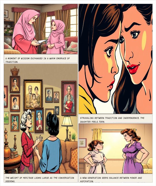 Boleh tak buat komik saiz A4 dalam satu komik ada 6 kotak. Komik tu ada 6 kotak. Komik dalam bentuk landskap. Saiz mesti sama dengan dalam komik sebenar (GAMBAR: 3 atas, 3 bawah). Komik dalam bentuk anime TAJUK KOMIK MASYARAKAT YANG BERPEGANG TEGUH PADA ADAT RESAM: KEPATUHAN TERHADAP ORANG TUA SUSUNAN KOMIK (LANDSKAP – 6 PANEL) [3 panel atas | 3 panel bawah] Panel 1 (atas) Situasi: Seorang ibu berhijab labuhwarna pink berbaju kurung songket sedang menasihati anak perempuannya berhijab labuh,ber