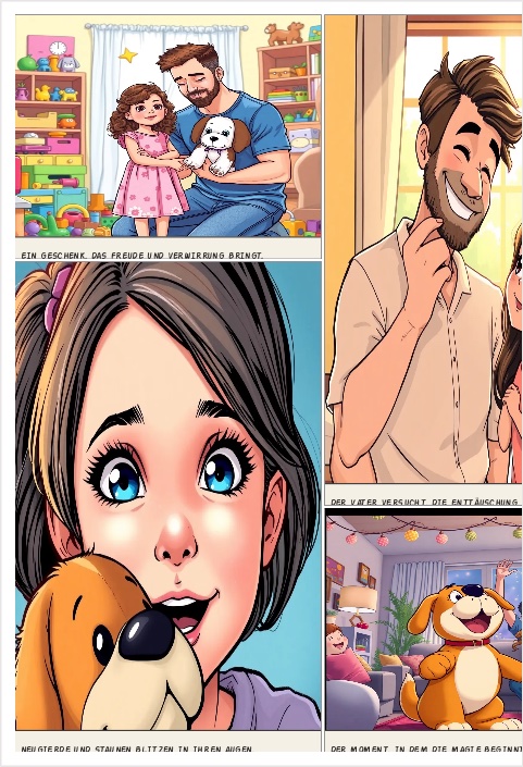 Im ersten Bild schenkt ein Vater seiner kleinen, süssen 9jährigen Tochter einen Plüschhund. Diese freut sich, ist aber verwundert, weil sie sich eigentlich einen richtigen Hund wünschte. Im zweiten Bild sagt der Vater:“Schau mal, dieser Hund hier kann aber singen und tanzen!“ Im dritten Bild sagt die Tochter erstaunt:“Echt? Wow wie cool“ Im vierten Bild sieht man wie der Hund singt und sich etwas hin und her bewegt und Vater und Tochter sich freuen.