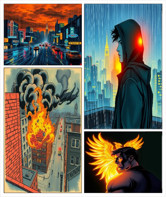 PANEL 1 (WIDE) Night city. Rain. Neon lights reflecting on wet streets. The sky has a faint orange glow, like something’s about to break. CAPTION: The city never sleeps. It just waits. PANEL 2 (MEDIUM) Your hero stands on a rooftop, back turned. Hood up. A soft glow leaks from his RIGHT shoulder under the fabric. HERO (THOUGHT): Please don’t be another long night. PANEL 3 (IMPACT) Explosion below. Fire and smoke erupt. Sirens scream. SFX: KRAAASH PANEL 4 (ICONIC) Hero turns. Phoenix fi