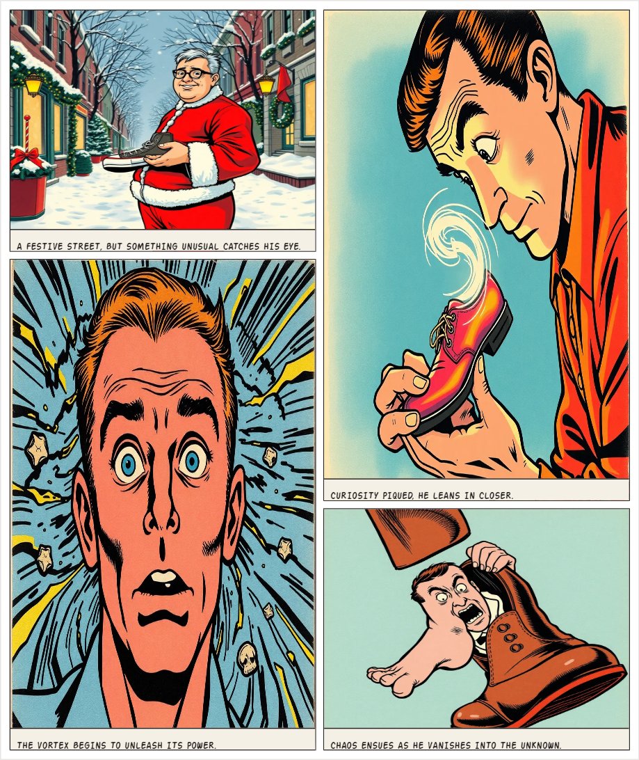 a guy wearing santa clothes with glasses. he takes a converse shoe in his hand, the shoe emits a vortex. the shoe sucks him inside, in the end only the shoe remains.