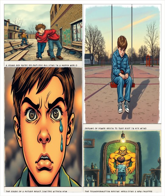 The story is about how a boy, who is always bullied in school l, later became the big muscular powerful beast half human in a dooms day world in the future