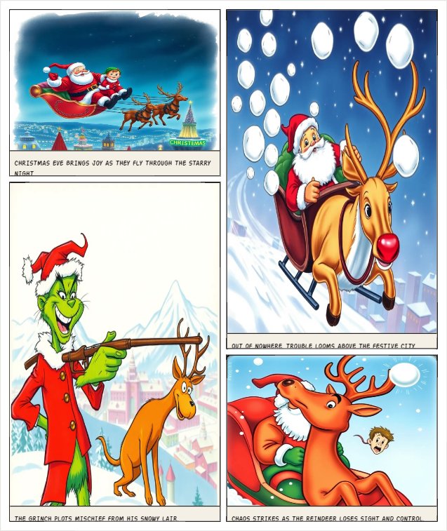 A hulk-inspired Santa and his son are flying through the city sky in their sleigh doing their Christmas Eve deliveries. Then out of nowhere, they are hit by flying snowballs. That's when they notice the nasty Grinch is using the fake antler on his pet dog to slingshot snowballs at the sleigh. A snowball hits the lead reindeer pulling the sleigh right in the eyes and now he can't see causing the sleigh to crash.