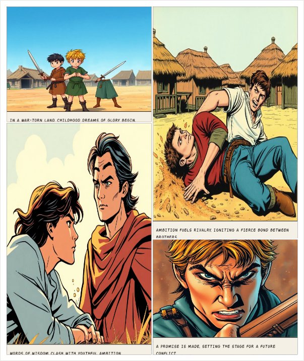 TITLE: “BROTHERS OF THE BLADE” GENRE: Action • Drama • Rivalry • Warrior SETTING: Ancient kingdom, war-torn land CHARACTERS ARIN – Calm, disciplined, fights with honor KAEL – Fierce, aggressive, fueled by anger PAGE 1 – CHILDHOOD Panel 1 (A dusty village training ground. Two small boys holding wooden swords.) KAEL: You swing like an old man, Arin! ARIN: And you swing without thinking. Panel 2 (Kael pushes Arin. Both fall.) KAEL: One day I’ll be the strongest warrior alive. ARIN (calm): Strength