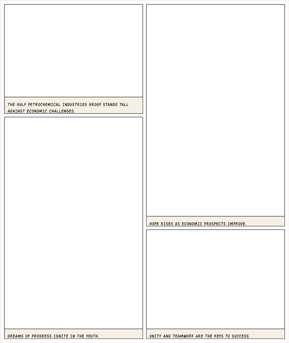 یک صفحه کمیک رسمی با سبک صنعتی. تصویر کارخانه پتروشیمی مدرن در پسزمینه، نمودارهای رشد اقتصادی در حال صعود، و مردم امیدوار در پیشزمینه. متن بالای صفحه: "نقش و عملکرد گروه صنایع پتروشیمی خلیج فارس در حل چالشهای اقتصادی کشور".