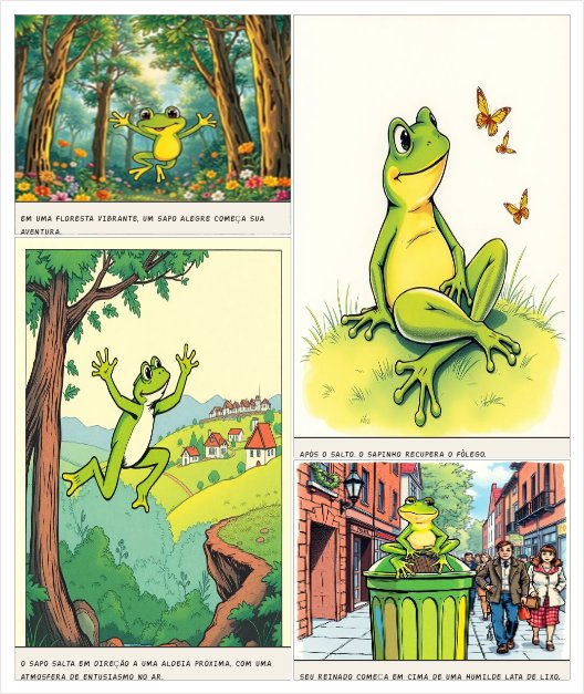Faça uma história em quadrinhos de um sapinho engraçadinho que pula na floresta, senta e depois d...