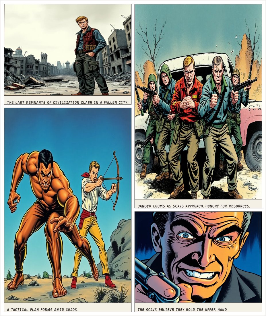 make a post apoclypic scene where 2 guys are fightng a team of scavs