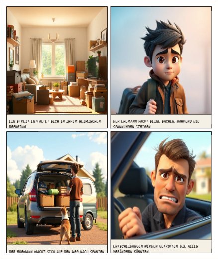 Ehefrau streitet mit Ehemann. Ehemann packt Koffer. Ehemann fährt mit Auto, Anhänger und dem Hu...