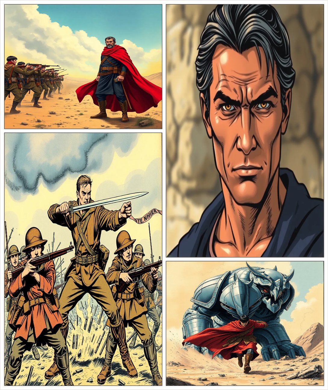 Panel 1 Wide shot. Soldiers aim rifles. Asqalani stands defiantly, cape sweeping the ground. CAPTION (V.O.) They came for gold… but they will find resistance. Panel 2 Close‑up. Asqalani’s eyes narrow. Dialogue: ASQALANI (shouting) You will not take what is ours! Panel 3 Dynamic angle. Asqalani slashes across incoming rifles; soldiers stagger back. SFX: SHING CAPTION (V.O.) For our people, for our land… I fight. Panel 4 Splash panel cliffhanger. Asqalani charging at a massive armored Hy