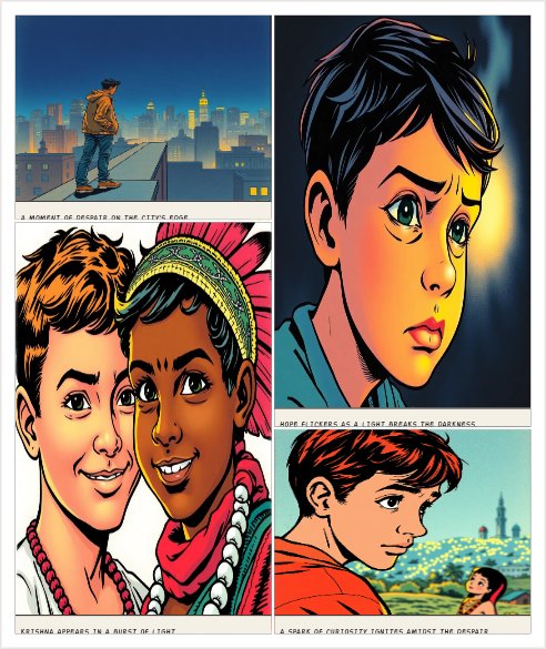 A superhero who is secretly krishna appears as a child when the character feels like ending life Generate illustrations with conversation