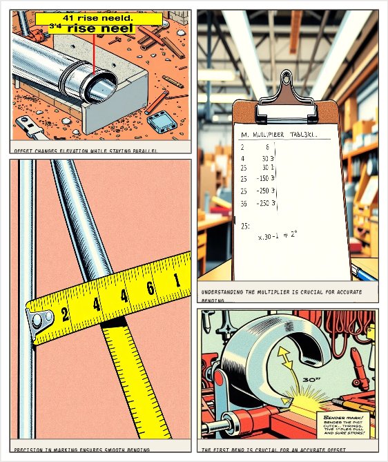 Conduit Offset Bend - 6 Panel Script (Compressed) Panel 1: Isometric view of conduit hitting obstacle. Show 4" rise needed. Label: "Offset changes elevation while staying parallel" Panel 2: Multiplier table. Highlight: 30°=2.0x. Formula: "Height × Multiplier = Distance Between Bends. Example: 4" × 2.0 = 8"" Panel 3: Tape measure on conduit. Two marks 8" apart. Text: "Mark first bend at obstacle, second bend 8" away" Panel 4: Bender at first mark, 30° angle. Arrow shows pull direction.