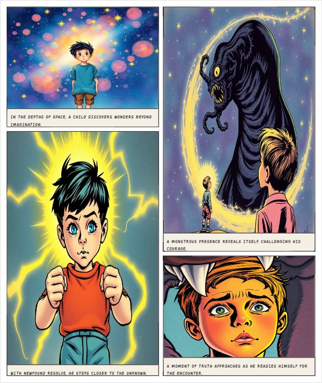 北斗神拳的会话风格,一个小孩走在星际之间,看见远处的银河怪物,自己身上开始发光