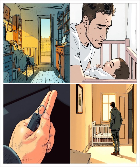 Scène cinématographique sombre à l’aube, dans un petit appartement parisien. Ilias, père de famille fatigué mais aimant, la trentaine, regarde tendrement son petit garçon de 20 mois qui dort dans son lit. Une lumière douce du matin traverse la fenêtre, tons chauds à l’intérieur contrastant avec des ombres bleutées. Une veste de chauffeur de taxi posée sur une chaise, les clés dans sa main. Ambiance intime, mélancolique mais pleine d’espoir. Style réaliste, très détaillé