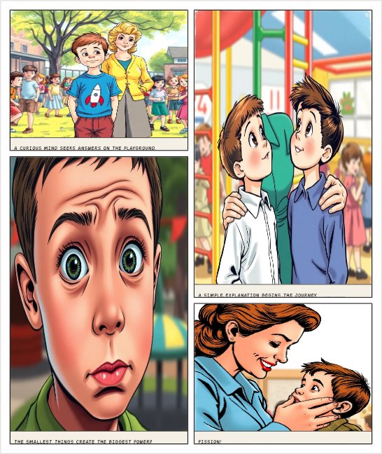 Peut tu me cree une bande dessiner pour des enfants de huit ans ou ce sera une discussion entre un enfant et ça prof pendant la récrer ou il l'un pose des question pour savoir : c'est quoi le nucléaire ,comment en fait de l'électricité , que fait t'on des déchets nucléaire , c'est quoi la fission et c'est quoi un atome .tout ça de manière rassurante et simple à la