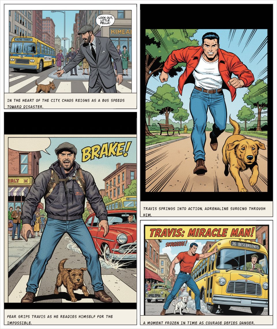 Travis with one hand stops the bus from hitting the dog. The dogs life is saved!