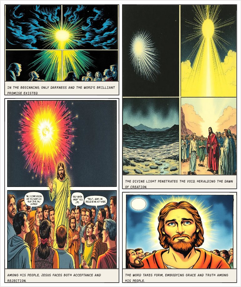 Four-panel biblical comic illustration, semi-realistic graphic novel style, ancient Middle Eastern setting, cinematic divine lighting. Panel 1: cosmic darkness with radiant divine light representing the Word before creation. Panel 2: light shining into darkness, creation below. Panel 3: Jesus among His people, some rejecting, others receiving Him. Panel 4: the Word made flesh, Jesus glowing with grace and truth. make it as nteresting and understandable as possible