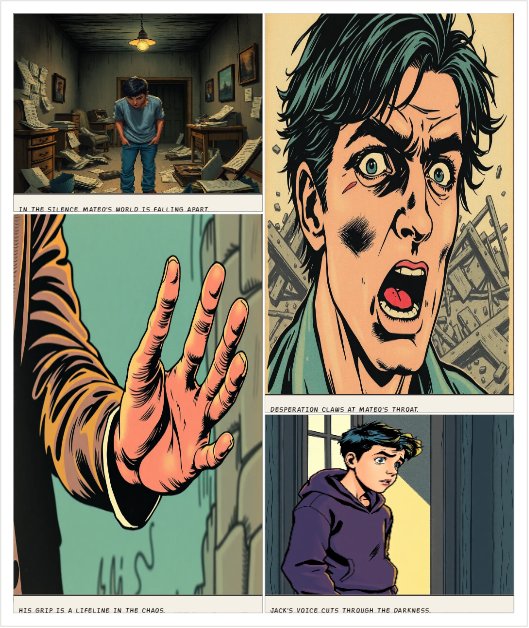 Mateo doesn’t cry pretty. He doesn’t hiccup softly or wipe his face and try to be dignified about it. He shatters. The sound that rips out of him is ugly—raw, animal, dragged straight from the center of his chest like something clawed its way up his throat. His body folds in on itself and then lunges forward all at once, hands scrambling, fingers clutching for Jack, like if he doesn’t grab him right now he’ll be ripped back into those four months of silence and rot. “Jack—” That’s all he ge
