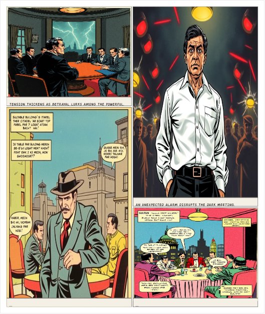PANEL 1 (Scene: Ek purani building "The Citadel" ke top floor par andhera kamra. Baahar bijli kadak rahi hai. Table par 7 Mafia Dons baithe hain.) SULTAN: (Thandi awaaz mein) "Is table par baithe 7 logon mein se ek ki niyat mein khot hai. Kaun hai wo gaddar?" KABIR: (Gusse mein chillate hue) "Jo bhi hai, uska sir meri talwar par hoga!" PANEL 2 (Scene: Achanak building mein ek alarm bajta hai. Red lights jalne lagti hain. Vikram Singhania khada ho jata hai.) VIKRAM: "Der ho gayi Sultan! Ye imarat