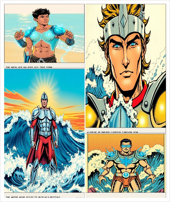 Panel 1 Description: Water armor forms over Rai’s body. Shoulder plates, chest armor, and gauntlets made of glowing water. Line (Narration): “The necklace unlocks his true form.” ⸻ Panel 2 Description: Rai’s eyes glow bright blue. A water crest appears on his chest. Waves crash behind him. Line (Rai): “I accept this power.” ⸻ Panel 3 Description: Full reveal of Rai as the Water Hero, standing tall with the ocean raging behind him. Line (Rai): “For my family… I will protect this world.”