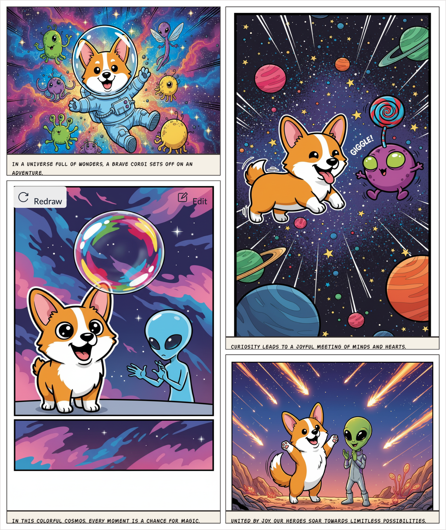 Generate a one-page cartoon-style comic story featuring a cute corgi as the hero. The setting is outer space, where playful, colorful aliens cause trouble rather than terror. The tone should be lighthearted, warm, and charming, with soft humor and expressive visuals. The corgi is brave but adorable, driven by curiosity and kindness. Use bright colors, exaggerated expressions, minimal stakes, and end with a joyful or hopeful moment.