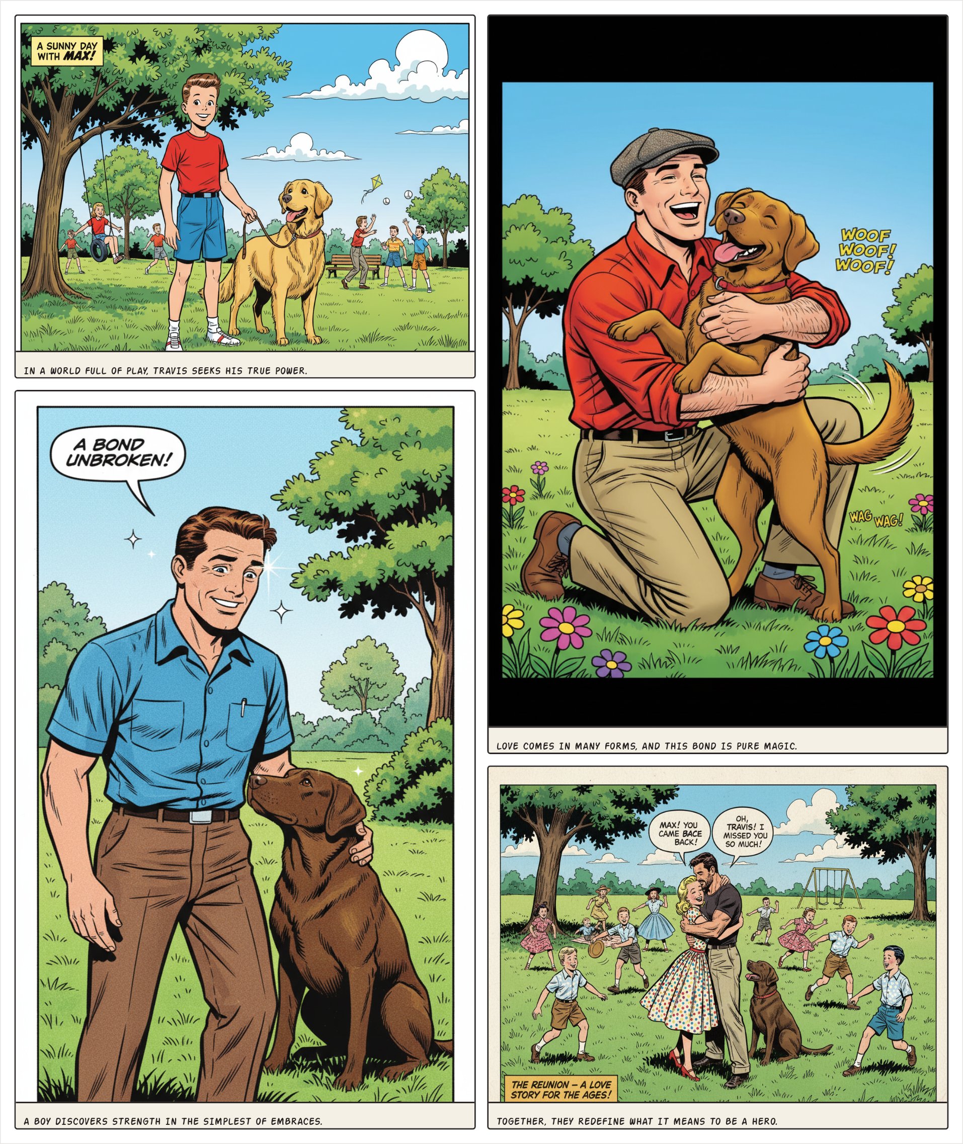 Travis and his dog have a big hug and Travis realizes he doesn't need super powers to be loved.