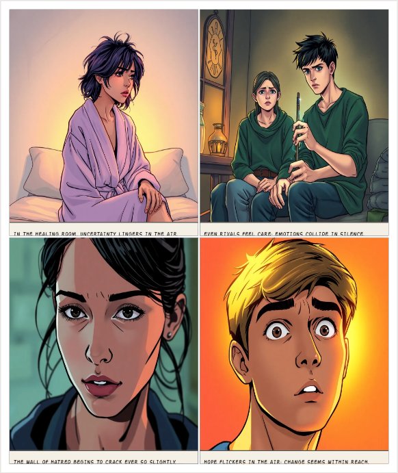 Panel 1: The healing room glows with soft, warm light as she sits on a cushioned bench, her robes slightly ruffled and hair still tousled from the duel. Anxiety shows on her face, and she glances sideways, unsure if he will stay or leave. Panel 2: He sits beside her, a mixture of guilt and awkwardness in his expression. His hands hover slightly over his wand as if unsure whether to gesture or remain still, revealing that even rivals can feel care. Panel 3: Slowly, the rigid wall of hatred betw