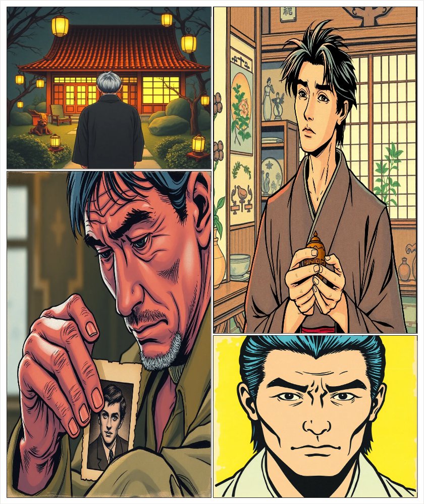 j'aimerais que tu me transforme ce scripte en bande dessiné, avec les images et les paroles des personages : Titre : Deux cultures, un même sang Case 1 : Le père Père (pensée) : « Cette maison représente mon passé… » « Mes parents m’ont appris à respecter nos traditions. » Case 2 : Les valeurs du père Père : « La foi, la famille, le respect… voilà ce qui compte. » « Le monde change trop vite. » Case 3 : Le regard sur la modernité Père : « Tatouages, piercings… ce n’est pas une bonne infl