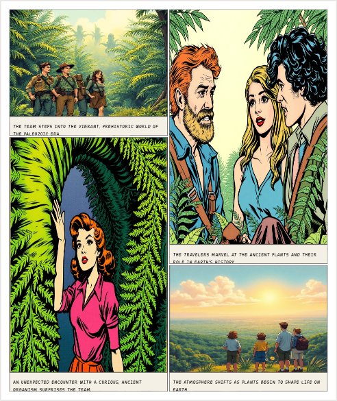 Page 2 (First Time Period: The Paleozoic Era) Panel 5: The team arrives in the Paleozoic Era, with lush forests and giant plants. Panel 6: The travelers discuss the first land plants evolving and how these plants shaped life on Earth. Panel 7: They interact with ancient organisms—perhaps a giant, fern-like plant person or early amphibians. Panel 8: The team notes how the environment is changing, as plants are converting CO2 into oxygen, which will change the atmosphere.
