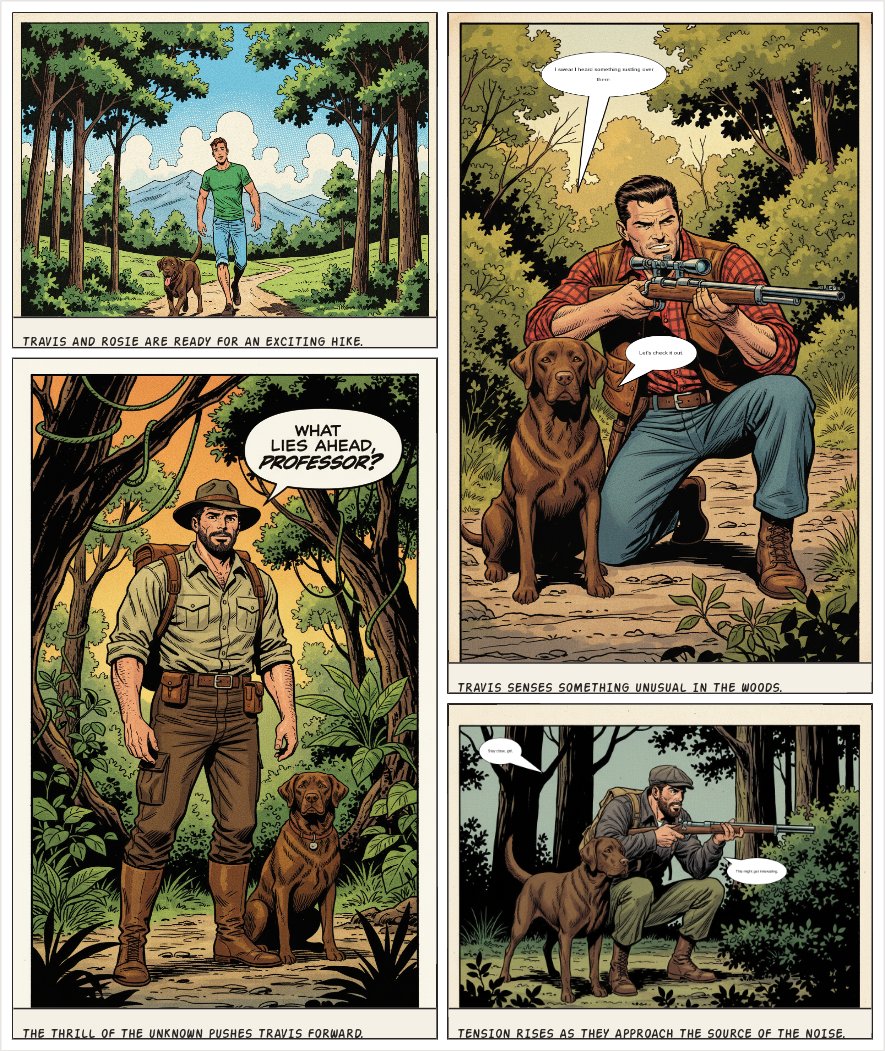 Travis on a hike wearing blue shorts with his brown dog named Rosie. Travis has a rifle