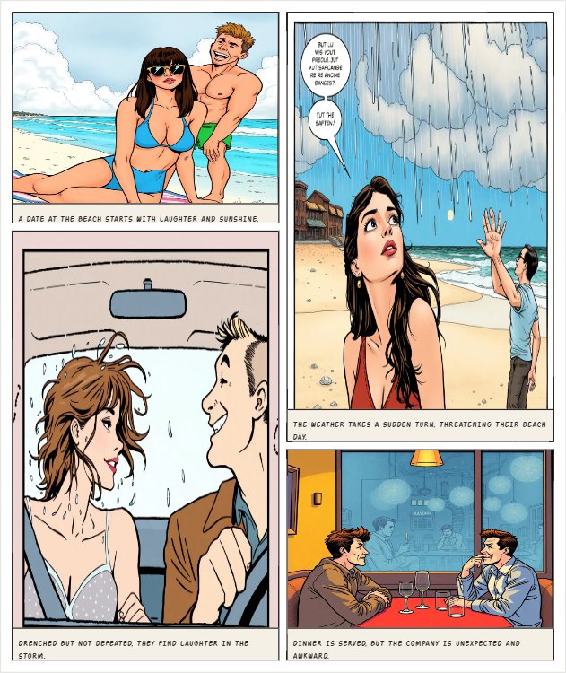 premier date d'un homme et une femme dans la vingtaine, femme avec la frange et les cheveux au carre brune, taille moyenne et l'hoome athletic assez grand cheuveux chatain clair coupe normal: 1. a la plage, les deux en maillot dans la serviette, temps un peu nuageux, 2. la pluis commence 3. deluge, les deux dans la voiture 4. au restaurant et pile des connaissance dans la table d'acoter (quatre hommes de 25ans)... un peu genant Pour chaque carre je veux que la petite phase en bas soit en