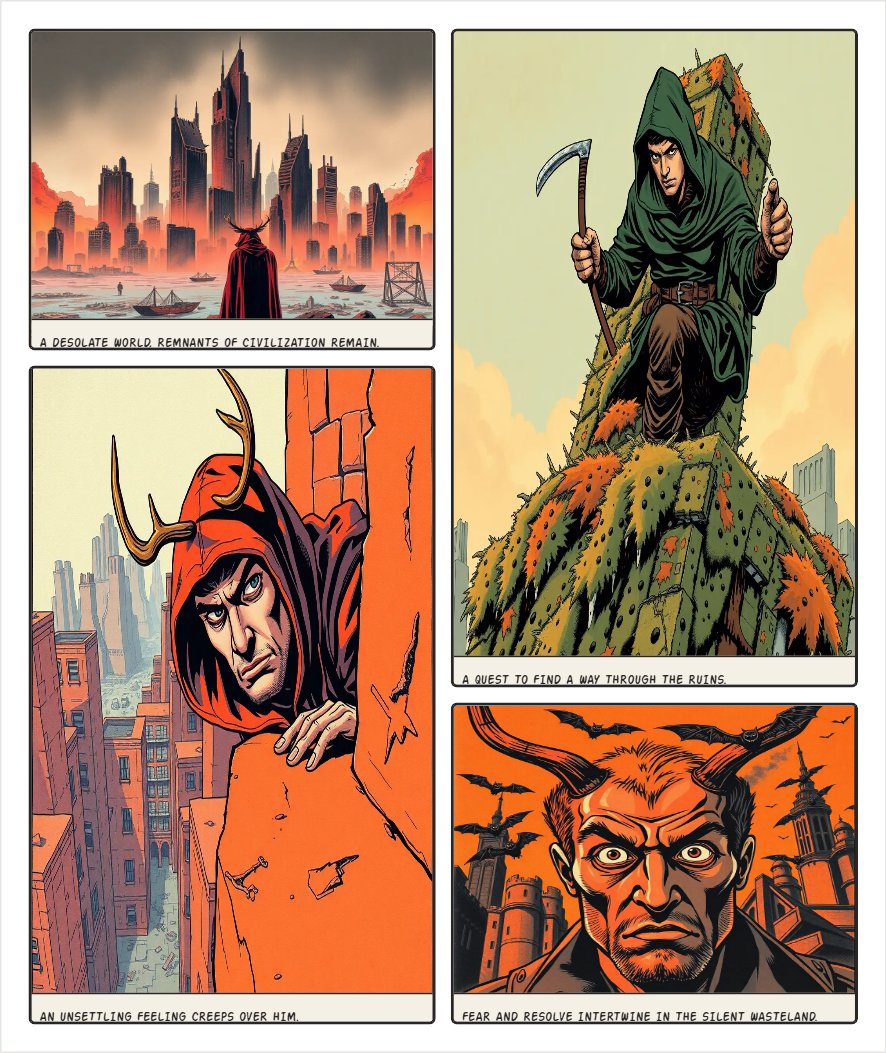 A cloaked man named with antlers piecring through the hood explores a barren dystopian wasteland....