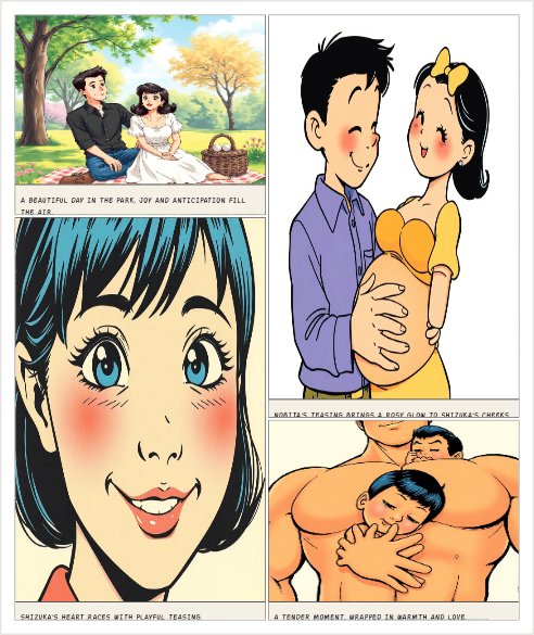 Lukiskan komik nobita dewasa dan handsome yang memakai kemeja hitam sedang mengusap lembut perut shizuka yang membulat mengandung anaknya. Shizuka yang memakai dress putih dan cantik. Nobita yang suka tease shizuka membuatkan shizuka malu dan membenamkan wajah ke dada bidang milik nobita.