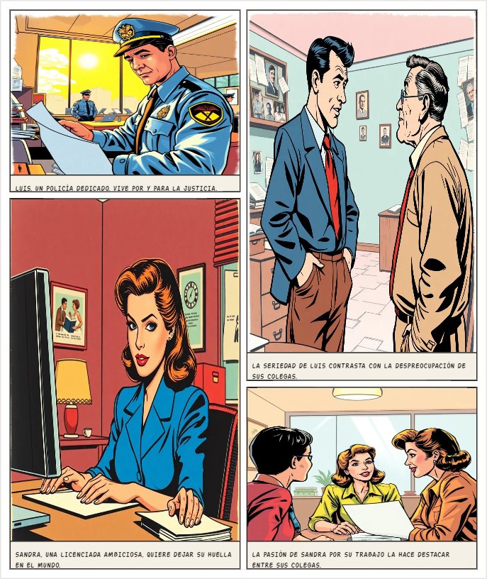Un Amor en Quetzales *Página 1: Introducción a Luis* - Presentar a Luis, un policía dedicado con un sentido de la justicia fuerte. Narra su rutina diaria y su trabajo en la comisaría. Describe su carácter y cómo siempre ha puesto su carrera primero. *Página 2: Introducción a la Licenciada* - Presentar a la mujer, llamada Sandra una licenciada que trabaja en las oficinas Quetzales. Describir su personalidad, ambiciones profesionales