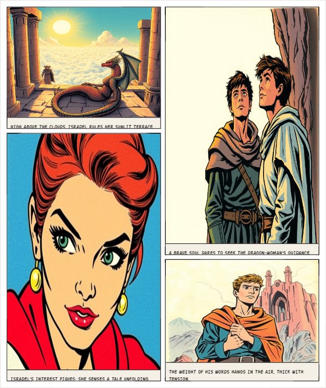 Panel 1 – Establishing the scale Wide cinematic establishing shot. A vast sun-drenched stone terrace high above the clouds, carved from pale gold and white marble, with massive pillars and reptilian motifs etched into the floor. Isradel, an enormous dragon-woman, reclines comfortably in the sunlight. She has smooth, iridescent scales in warm gold and ember tones, long curved horns, slit pupils, and folded wings larger than the terrace itself. Her posture is relaxed and possessive, like a loung