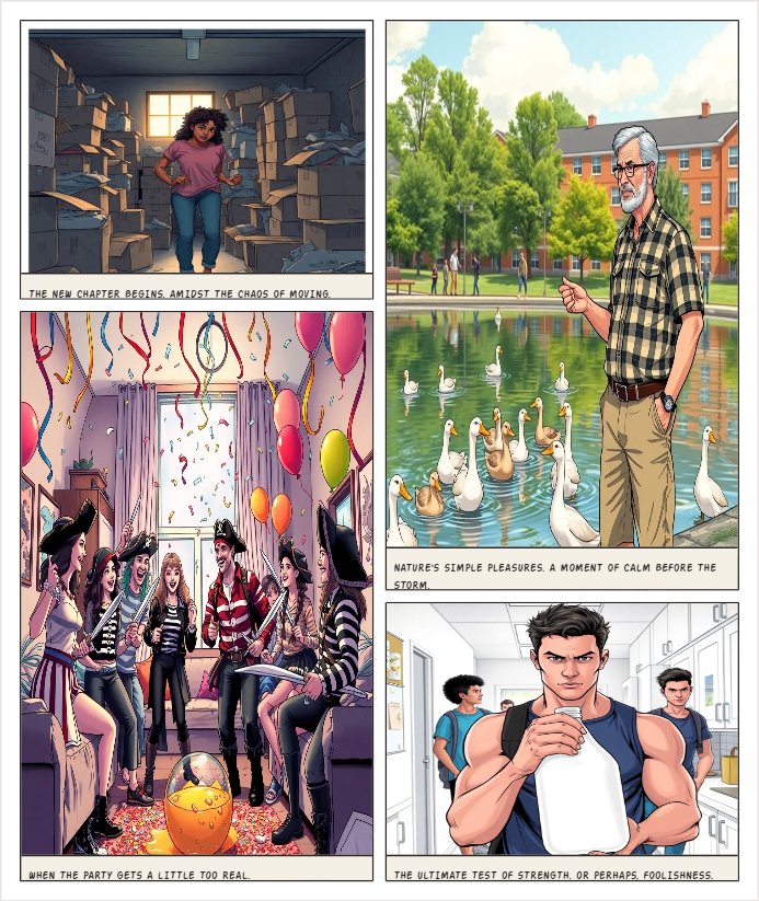 Panel 1 Nosa unpacking boxes. Caption: Joined later. Panel 2 Joel feeding ducks. Caption: There were ducks. Panel 3 Pirate party chaos. Caption: The Pirate Party. Panel 4 Enoch lifting gallon of milk. Caption: The Gallon Challenge.