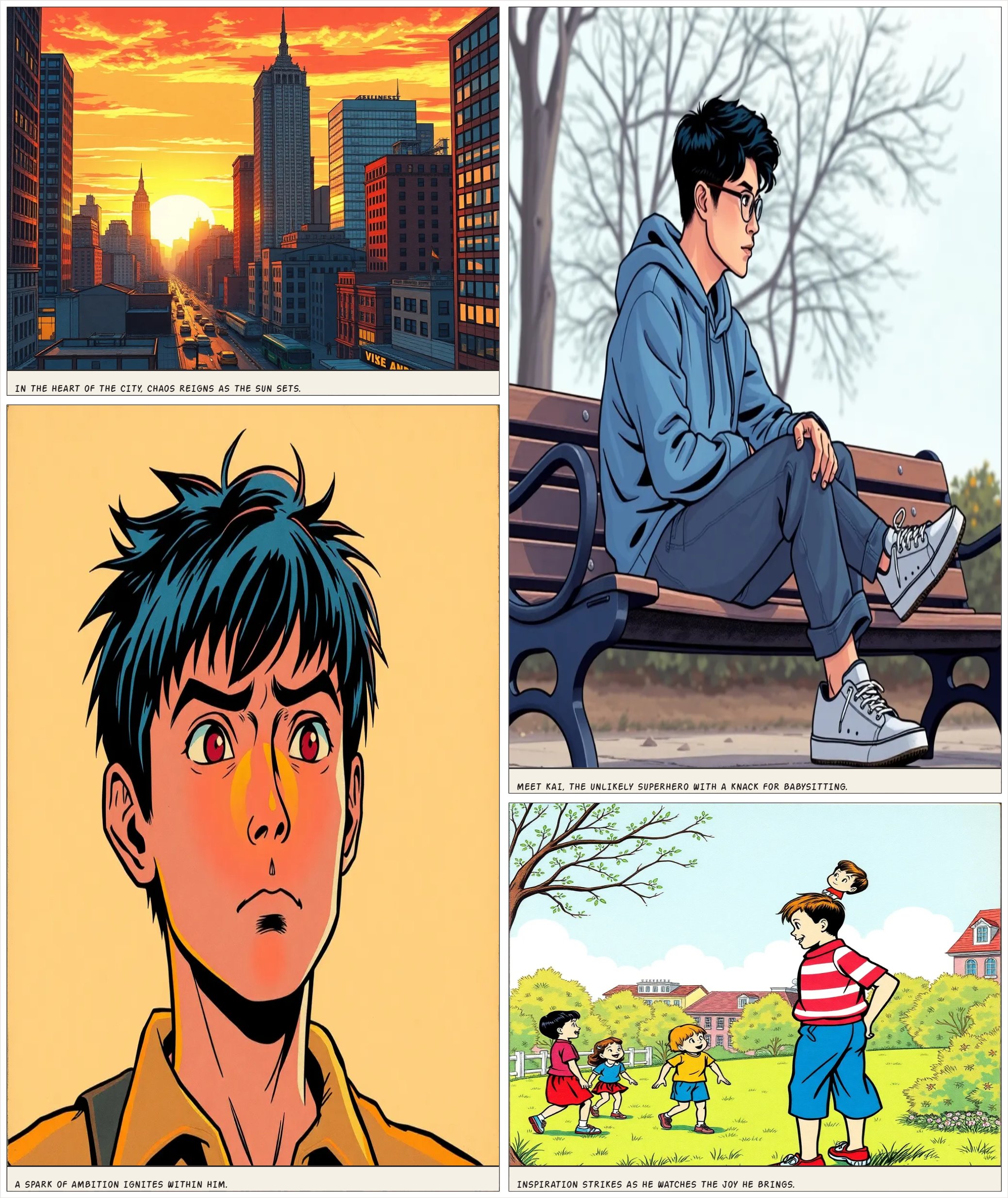 A young Handsome Asian teen with black hair and brown eyes. He's a superhero who's super power is being available to babysit whenever